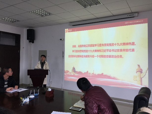 宣讲会上,张洁书记主要从三个方面对十九大精神进行了阐述:一是要充分认识学习宣传贯彻十九大精神和习近平总书记在贵州省代表团重要讲话精神的重大意义,二是要深刻学习领会十九大精神和习近平总书记在贵州省代表团重要讲话精神,三是要推动十九大精神和习近平总书记重要讲话精神在我院落地生根、开花结果。张洁书记尤其勉励大家,要以学习贯彻十九大精神为契机,大力弘扬新时代贵州精神,团结奋进,拼搏创新,苦干实干,后发赶超,使学院在人才培养、学科建设、师德师风、教学科研、服务地方经济建设等方面取得更大的进步!