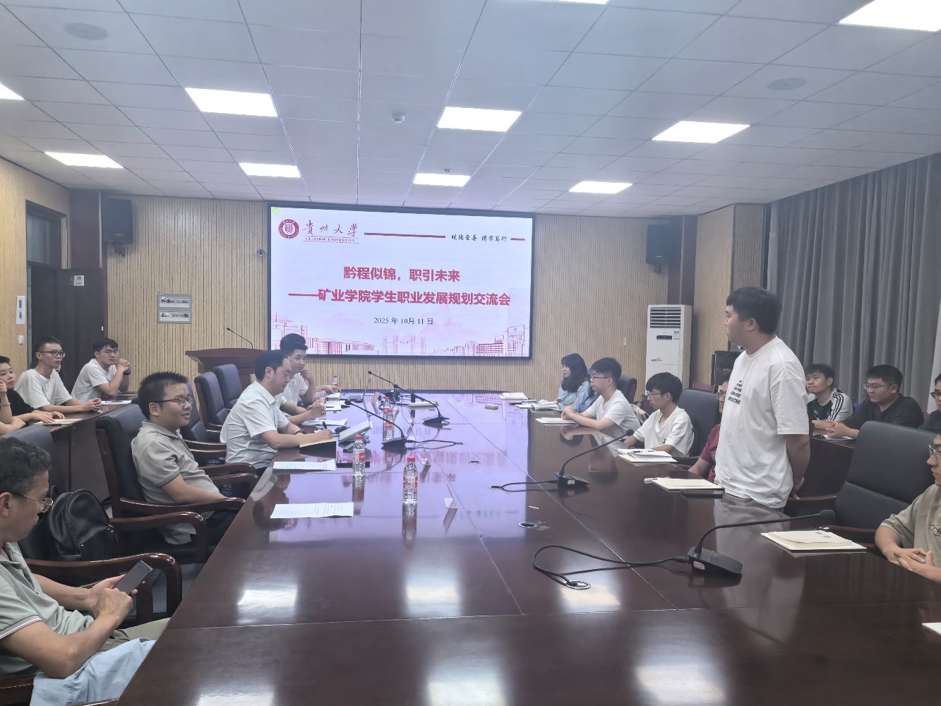 2025年10月11日晚,贵州大学矿业学院“黔程似锦,职引未来”学生职业发展规划座谈会在学院南楼305会议室顺利举行。本次座谈会旨在帮助临近毕业学生深入了解矿业行业发展趋势,科学规划职业路径。会议由矿业学院特聘教授陶剑主持,特邀贵州省能源局煤炭处副处长赖笼作为嘉宾出席,学院党委副书记陈兴帅、采矿教研室主任王沉等教师及学院大三、大四及研三年级80余名学生共同参与。