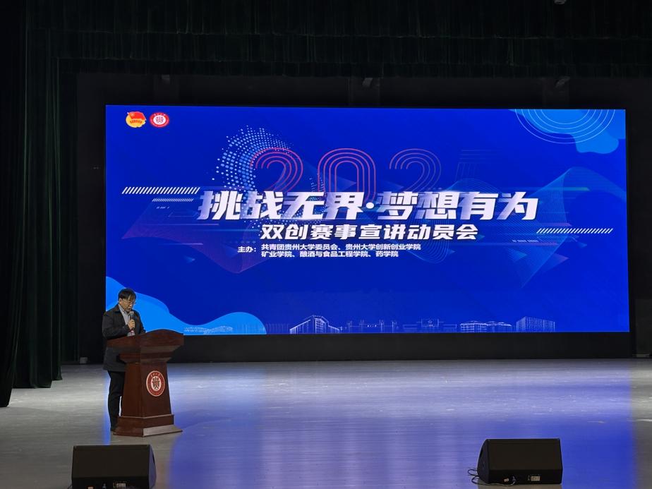 (图文 张文婷)为培养学生科研能力,积极投身科技创新,矿业学院、酿酒与食品工程学院、药学院于12月18日19:00在溪山剧场联合举办“挑战无界·梦想有为”双创赛事宣讲会。酿酒与食品工程学院院长黄永光,药学院党委副书记(主持党委工作)李焱,校团委副书记杨晓椿,矿业学院党委副书记陈兴帅出席此次会议。2025级研究生、本科生共600余人参加会议。宣讲会由陈兴帅主持。