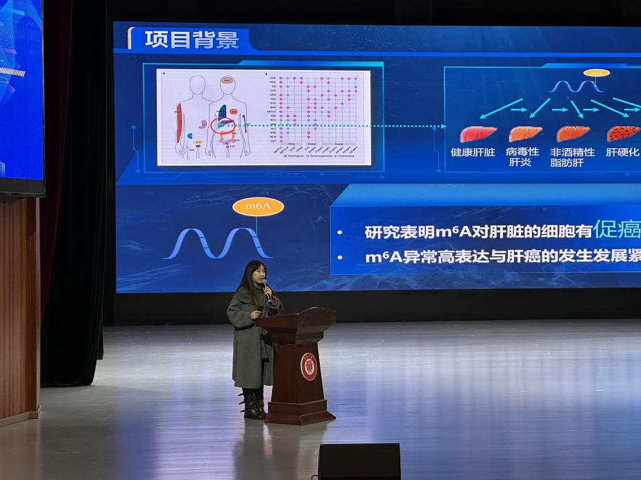 化学与化工学院《“光启膜法师”——国际首创3D多孔光催化降解薄膜》、药学院《别出新“裁”——基于m6A RNA甲基化肝癌早筛的健康中国领跑者》、矿业学院《煤矸石造土造地生态修复与林草碳汇协同技术研究》、酿酒与食品工程学院《独具菌“芯”——基于生物合成智造赋能粮食基发酵食品技术升级》四支团队带来了精彩的路演,为现场观众展现了一场酣畅淋漓的科技盛宴。矿业学院研究生张华瑞同学从敢揭榜、勇挂帅、破难关三个方面,给在座新生分享了参赛心得。