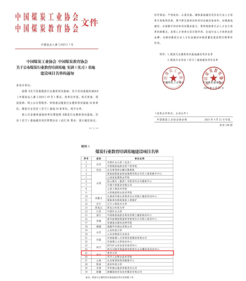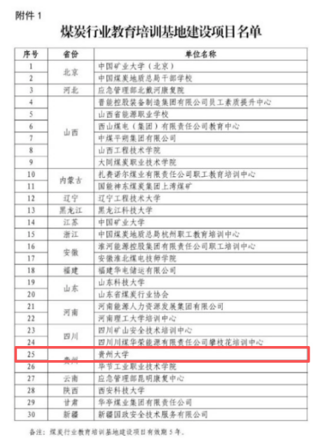 近日,中国煤炭工业协会与中国煤炭教育协会联合公布煤炭行业教育培训基地建设项目名单,贵州大学成功入选。